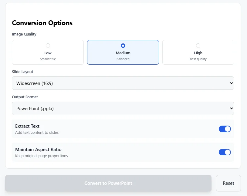 Convert your PDF documents to PowerPoint presentations. Each page becomes a slide.